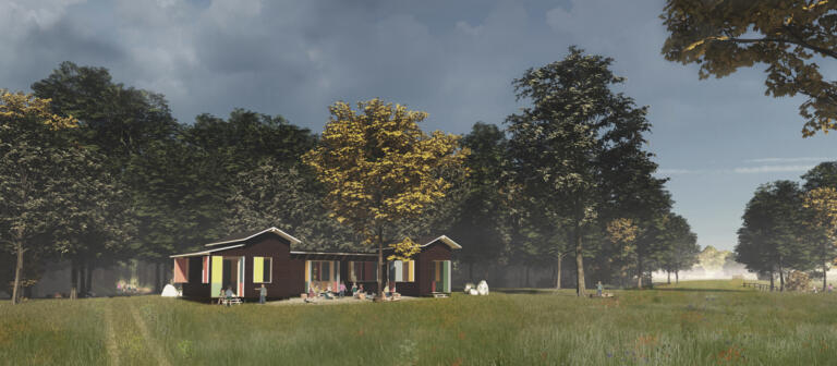 Zwei verschiedene Modultypen bilden in Verbindung mit- und untereinander, eine Vielzahl von Raum- größen, Abfolgen und Formen. Sie geben darüber hinaus die Möglichkeit bestehende Einrichtungen zu ergänzen. Diese Skalierbarkeit schafft eine große Bandbreite an Anwendungsformen, die auf alle genannten Kernkriterien eingehen kann, nie starr und immer individuell ist. Massivholzwände verein- fachen die Konstruktion erheblich bei gleichzeitig hohem Vorfertigungsgrad. Die Module werden vorproduziert und im Ganzen geliefert. Durch das Auflegen auf Punktfundamente wird der Waldboden geschont und eine Versiegelung vermieden.